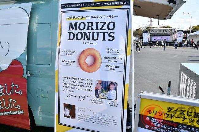 実際に会場にて揚げたての「モリゾウドーナツ」を食べてみたところ、表面はサクサクで中はとてもモチモチとしており、味付けはシンプルながら、しっかりと食べ応えと満足感もありました。グルテンフリーでヘルシーな点に魅力を感じる人も多いと思われました。