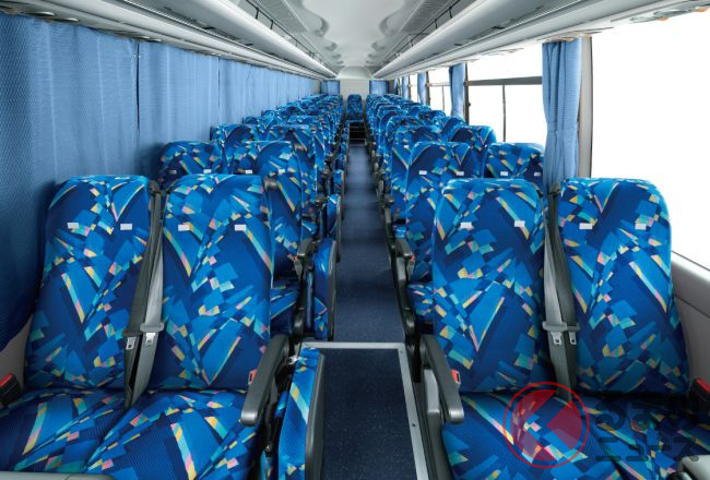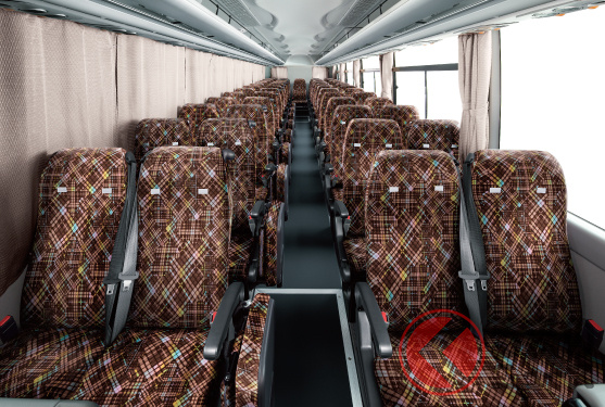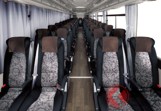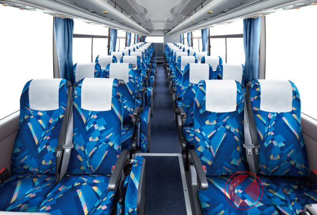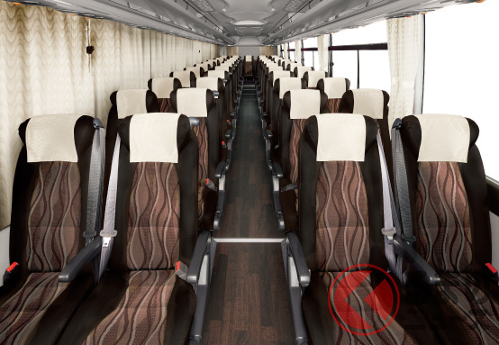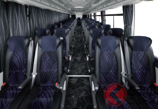現在販売中のモデル(ガーラ)では、31人乗り(貸切 8列)から62人乗り(貸切 12列)まで設定しています。全車360馬力・1569Nmを発揮する8.9リッター直列6気筒ターボディーゼルエンジンを搭載。7速AMTを組み合わせます。