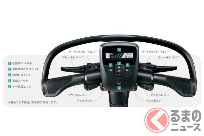 操作は、ハンドル左右にあるアクセルレバーで発進・加速・減速・停止をコントロール。