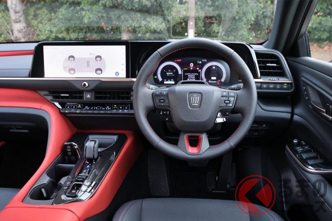 それに合わせてステアリングのステッチや加飾、シートベルトも同色でコーディネイト。クラウンとは思えない大胆な挑戦には賛同するも、「スポーツ=赤」からの脱却を感じさせる提案も欲しかったかなと。更に言うとフル液晶メーターも専用表示があっても良かったのではないでしょうか。