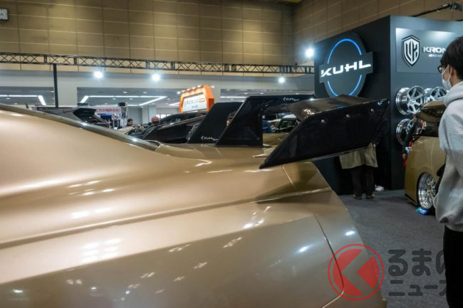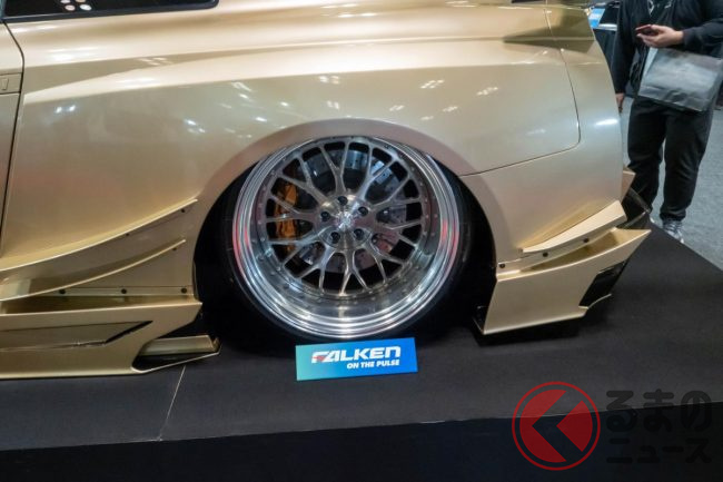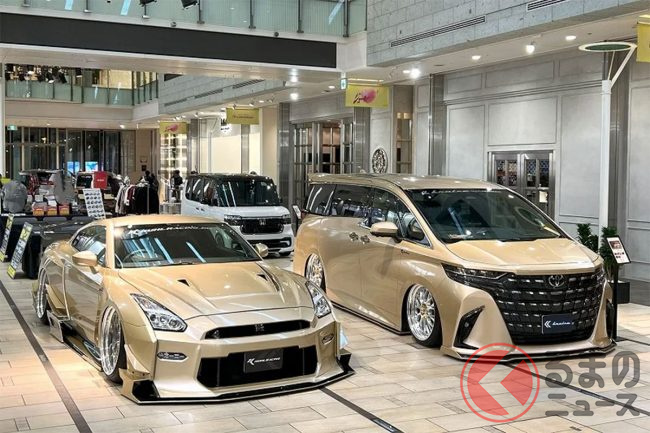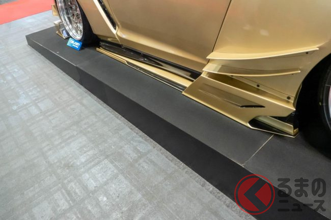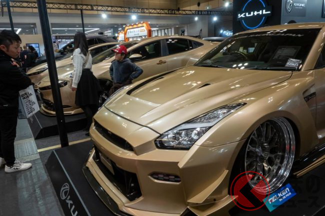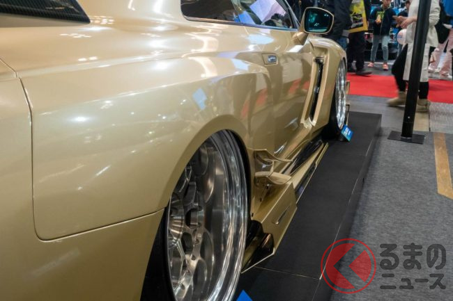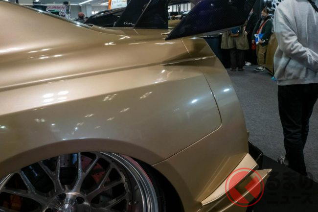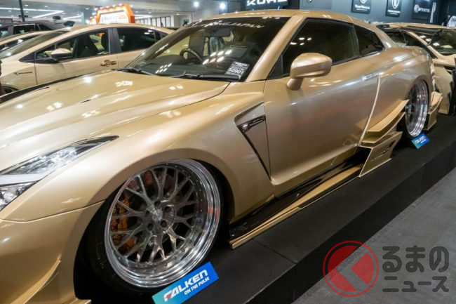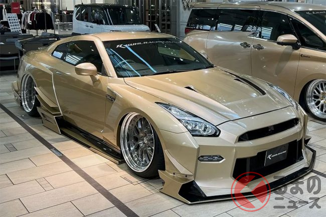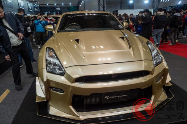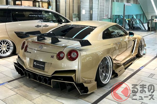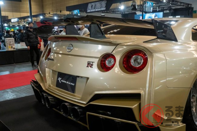“超ワイド”な日産「和製スーパーカー」実車公開! 極太マフラーと巨大ウイングがすごい! 眩しく“煌めく”金ピカ「GT-R」栄に登場!