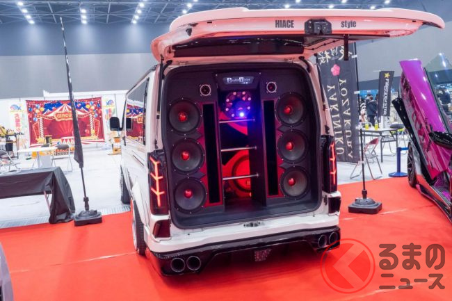 まさかの「“ランボルギーニ”商用バン」実車公開!? 4本出しマフラーに爆音スピーカー装備! もはや“スーパー商用車”な「ハイエース」とは