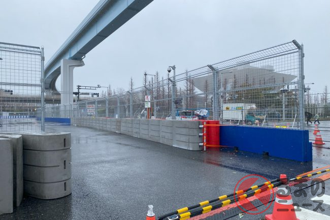 荒れ狂う暴風雨の金曜日午前。有明駅を下りて真っ先に目に入ったのは、ビッグサイトをぐるりと取り囲むフェンスです。