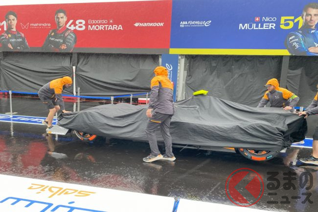 館内からホームストレート方面へ出ようとした瞬間、突風で傘が壊れ「オーマイゴッド…」と嘆くスタッフや、全身ずぶぬれになってガレージへ向かうメカニック。F1でも日本グランプリはよく大雨に見舞われますが、今回もさっそく”洗礼”のような天気でした。これでも午後には一転快晴となり、そのまま土曜の決勝も迎えそうのですから、これもドラマのひとつと言うべきでしょうか。