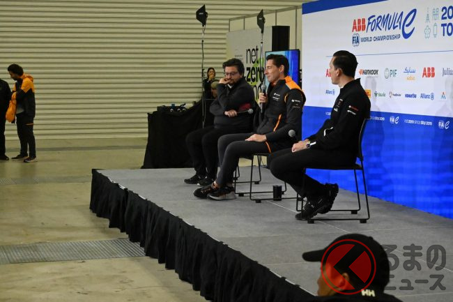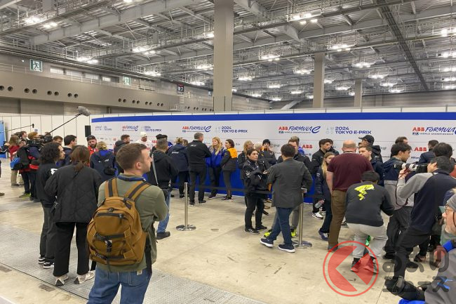 12時半から、東7ホールのメディアセンターでチーム代表とドライバーの会見が始まりました。見慣れたいつものビッグサイトの一角に簡易のステージと椅子を置いただけの会見場ですが、そこでは長いシーズンへの展望と、そのひとつである東京大会について、それぞれ熱い決意の言葉が紡ぎだされていました。