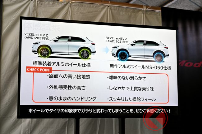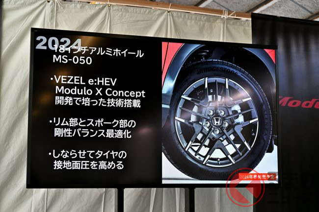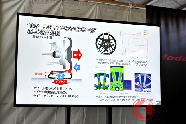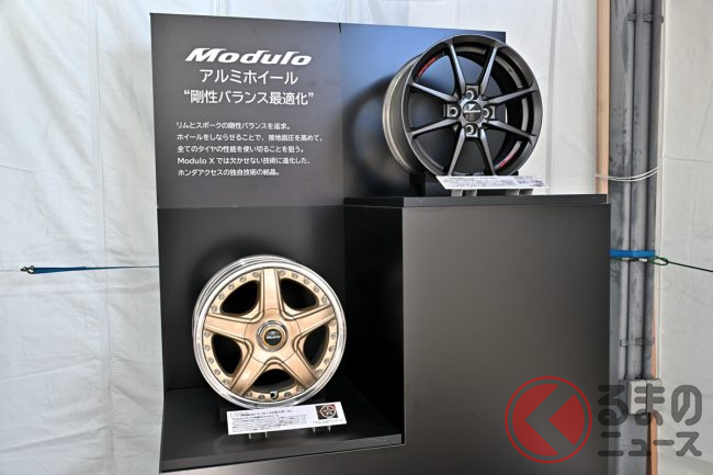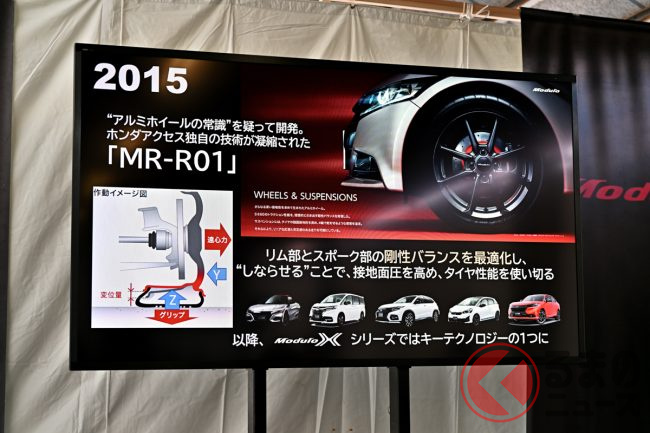 アルミホイールはただ高剛性・軽量化だけを目指すのではなく、リム部とスポーク部の剛性バランスを最適化し、“しならせる”ことで、接地面圧を高めタイヤの性能を使い切る、というホイールを作り上げ、以降ホンダアクセスが展開する純正コンプリートカーである「モデューロX」のキーテクノロジーになる製品となりました。