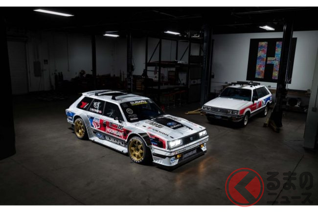 6速MT搭載! “旧車顔”のスバル「最速ステーションワゴン」実車展示! 「角目4灯」に860馬力超えエンジン搭載! 「魔改造マシン」が米で再登場