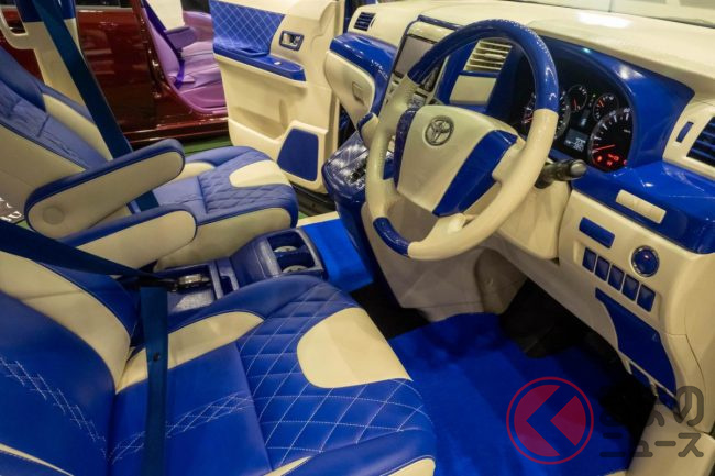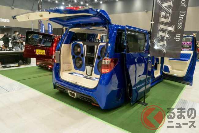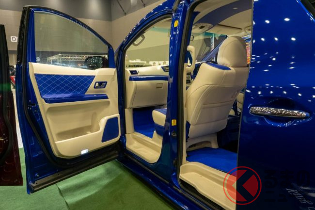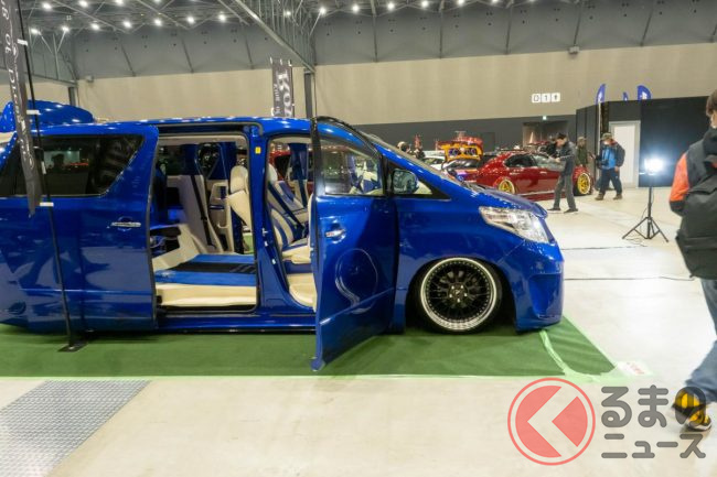 “レクサス風”「アルファード」実車展示! 「完成まで5年」の内外装“鮮烈ブルー”仕様! センターマフラーもカッコイイ「ド迫力ミニバン」来名
