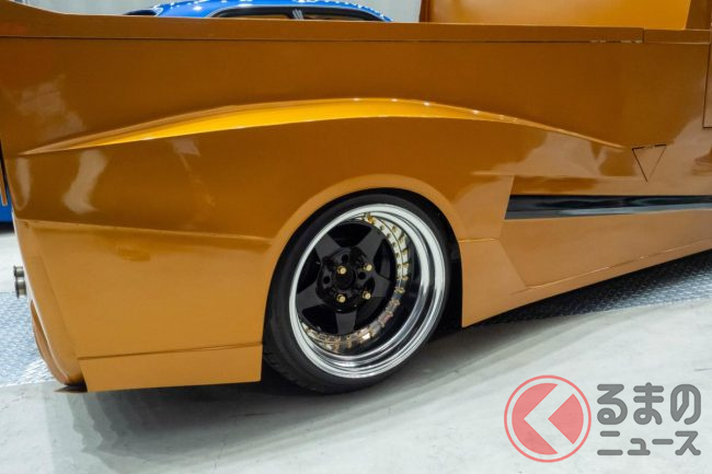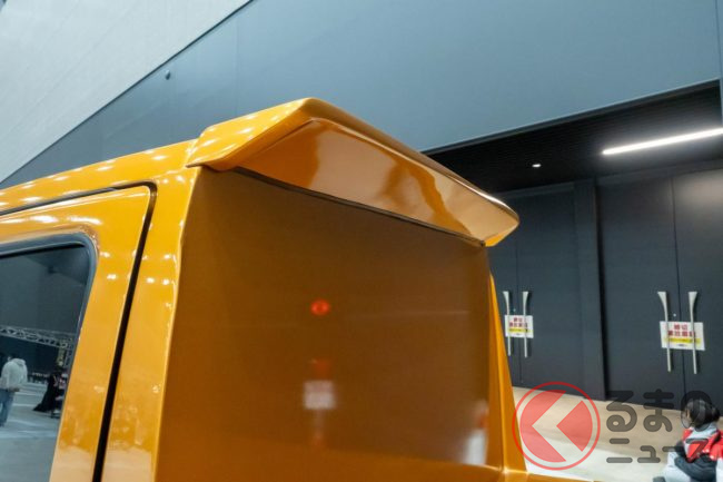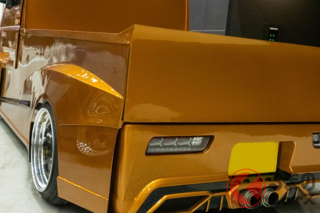 荷台部分はすべて覆われており、その後端は上向きに少しだけ傾斜。空気抵抗に配慮していそうなのが伺えます。また、エキゾーストも換装されているようで、まるでスポーツカーのようなセンターマフラーになっていました。