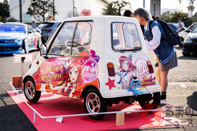 50ccエンジン搭載のミニカーは日頃からあまり目にする存在ではありませんが、その上痛車ということもあり、痛車天国の会場では来場者が興味津々な様子でsakaさんのアビーを楽しんでいました。