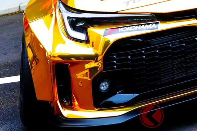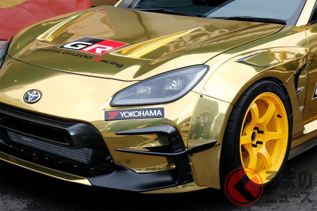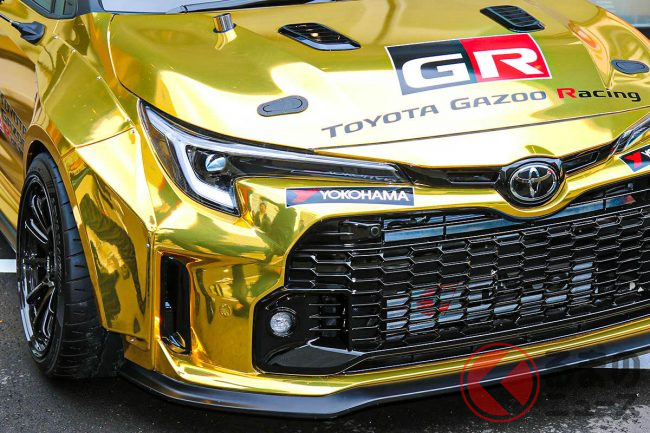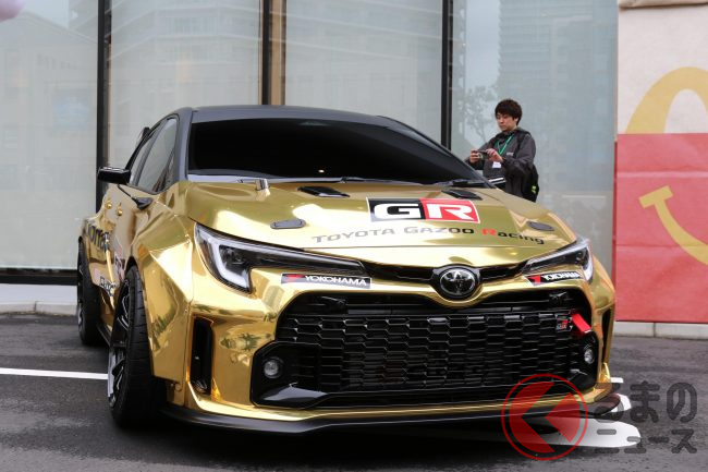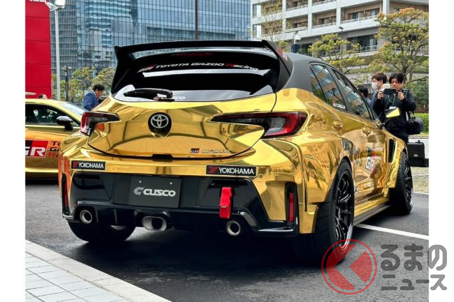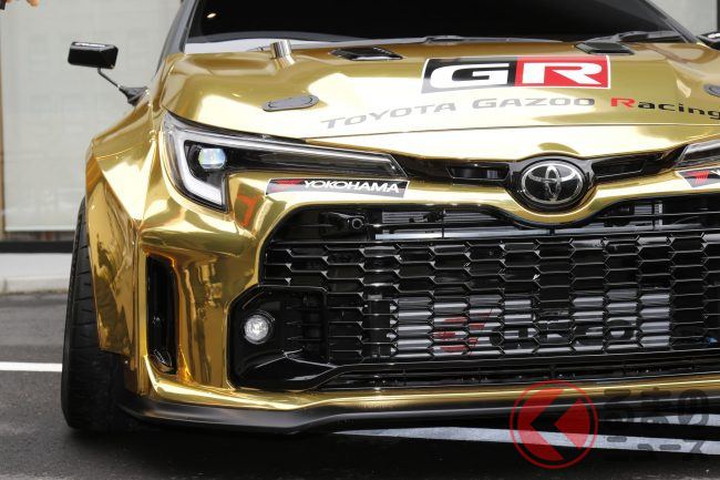 えっ…! トヨタが超ワイドな「爆速カローラ」実車初公開! ド派手すぎる「過激カスタム」採用した「公式ドリフト仕様」金色で登場!