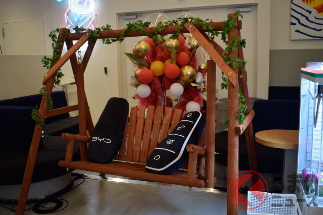会場ではゲストが監修した、それぞれのライフスタイルに合わせた展示もしているほか、来場客が会場に展示されているBYDのEVを見て「EVありかも」「BYDありかも」と感じたポイント“ありかもPOINT”をステッカーに書き込み、会場内にあるボードに貼り付けてシェアすることで、イベントオリジナルステッカー、NEW ERAキャップやタオルなどのBYDオリジナルグッズ、トークイベント登壇者のグッズなどが当たる、クレーンゲームを回せるキャンペーンも実施しています。
