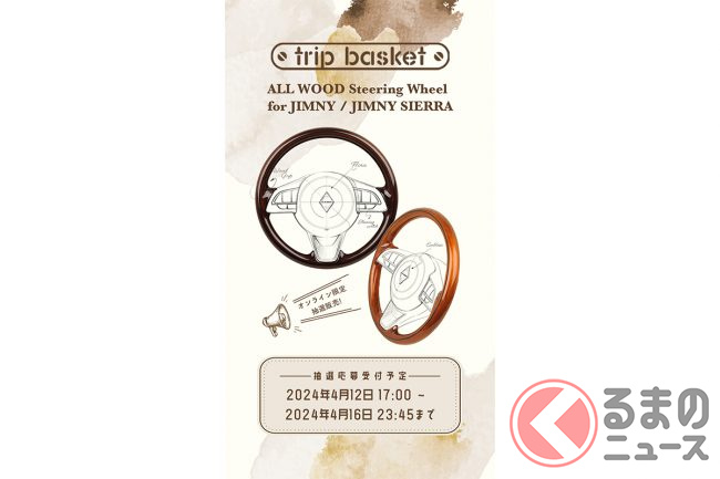 ダムドが2024年4月12日17時、現行型のスズキ「ジムニー」(JB64)/「ジムニーシエラ」(JB74)専用の全周ウッドステアリング「<trip basket>ALL WOOD Steering Wheel for JIMNY / JIMNY SIERRA」(価格:8万8000円/消費税込み、送料別)の抽選応募受付を開始しました。