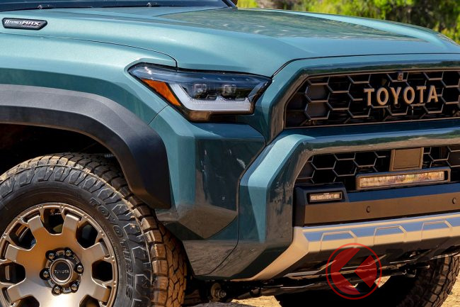 新型4ランナーは、直線を多用したタフな外観デザインを採用。新たなハイクリアランスバンパーなどを備えるなど走破性も重視されています。