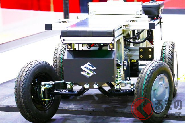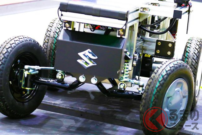 スズキが「謎のクルマ」実車公開! めちゃゴツい“骨組み”に「Sマーク」装着! “強靭な構造”で未来を支える「新型ユニット」に期待!