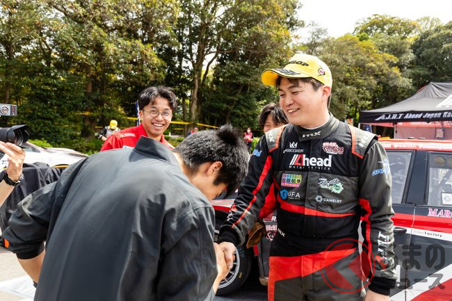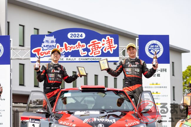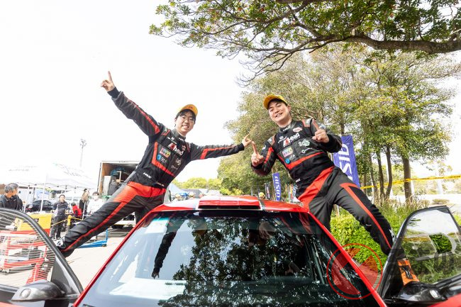 そんな中、若いチームが膨大な予算と豊富な人材、最新スペックのマシンをそろえたワークスチームに立ち向かうなんて、見てる方も熱くならないはずがありません。とにかくクルマを壊せない新井・松尾組は、2位に浮上した勝田・木村組とのタイム差を考えながらペースをコントロール。勝田・木村組に40.4秒差をつけて新井選手は2020年以来の総合優勝、松尾選手にとっては全日本初参戦で初優勝を飾りました。
