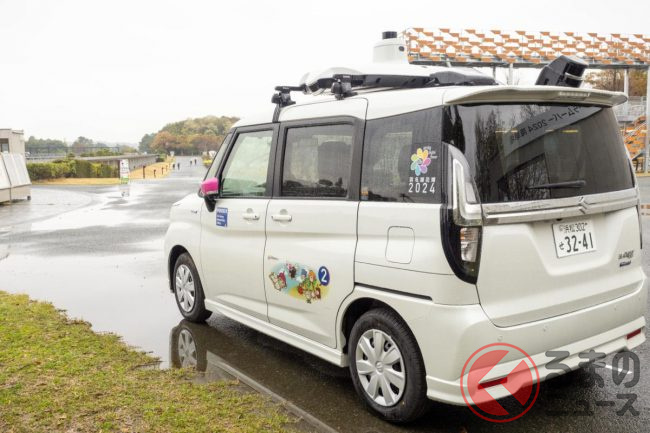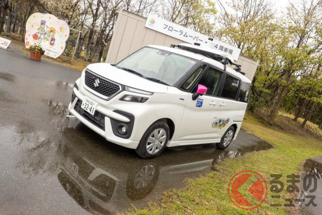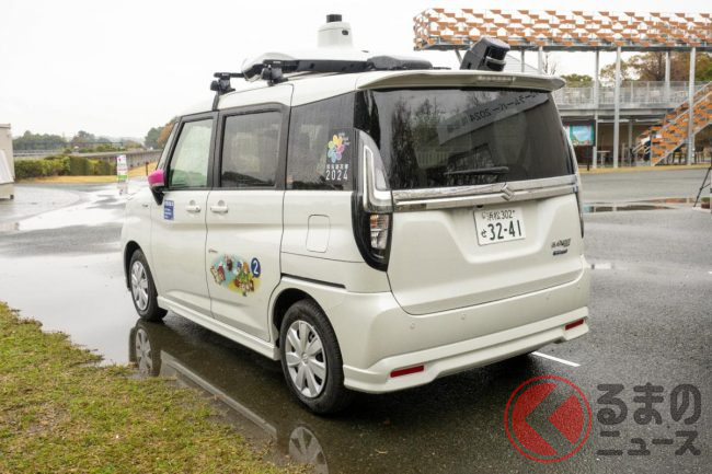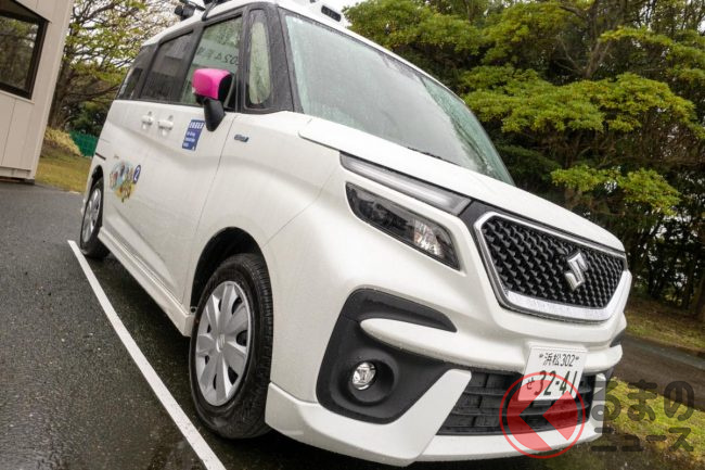 スズキ「“超凄い”ソリオ」実車展示! 高機能レーダー多数搭載! “自動で走る“機能搭載の「ハイトワゴン」運行の理由とは