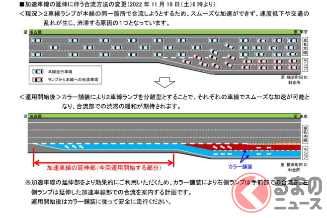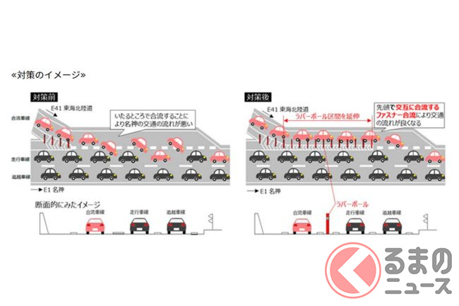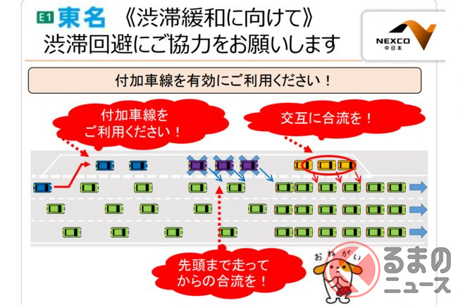 こうしたことからNEXCO各社では、合流部での渋滞が発生しやすい場所で、看板やLED表示板によってファスナー合流を呼びかける表示や、ラバーポールの設置によって加速車線と本線とを分離し、合流地点が先頭部分の一か所のみになるような仕組みの導入が進められています。