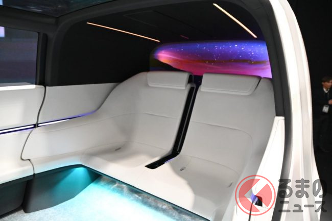 ルーフは2列目の上までガラス。3列目以降は室内天井にディスプレイがあり、そこに屋外の風景を表示します。