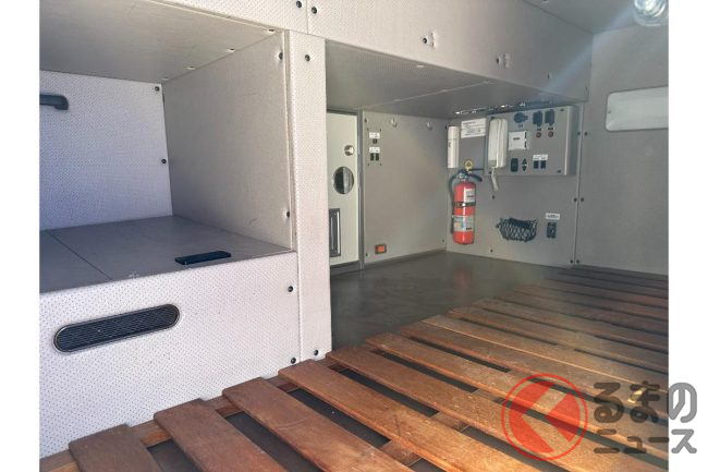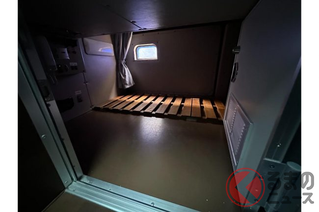 仮眠室は車両により異なりますが、足を延ばし横になるスペースがあり、非常食が備蓄できるスペースやエアコンもあります。空間の温度は車内と同じです。