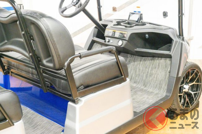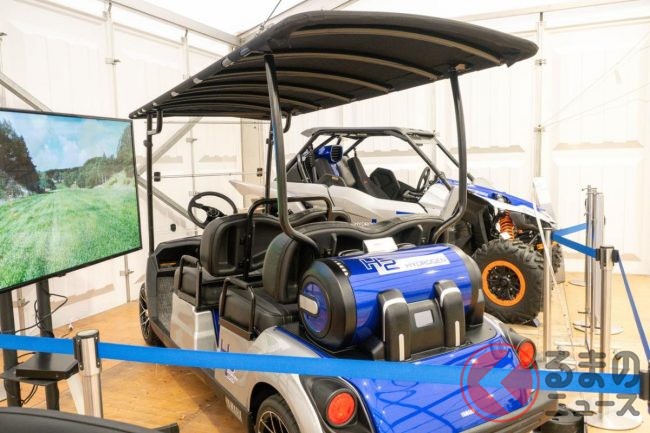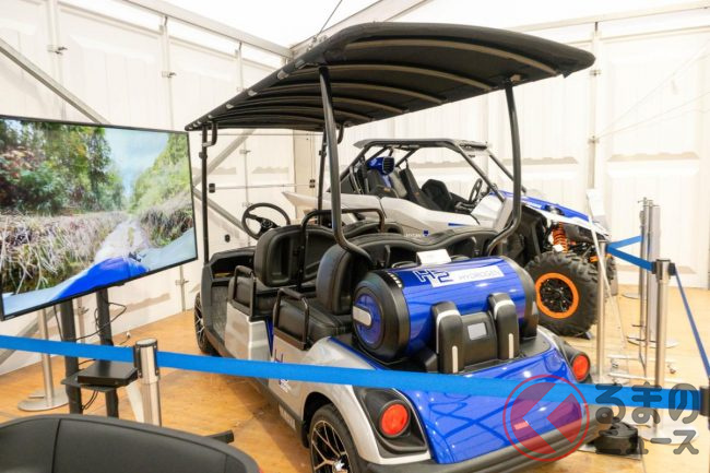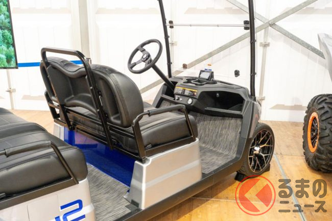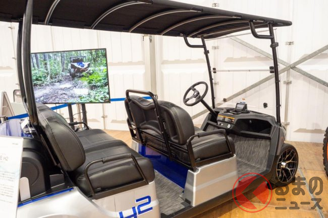 展示していたのは2台の水素エンジン車です。1台がゴルフカー「DRIVE H2」。こちらは米国を中心に世界各地で販売している4人乗りゴルフカー「Drive2 Concierge 4」をベースにしたコンセプトモデルです。