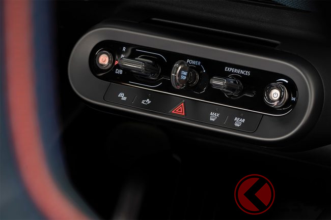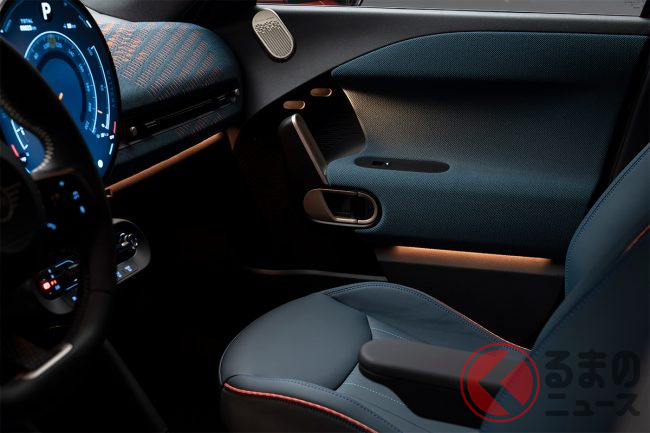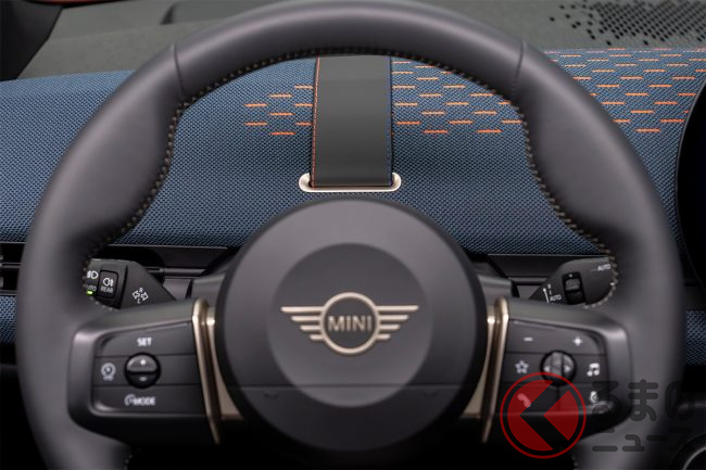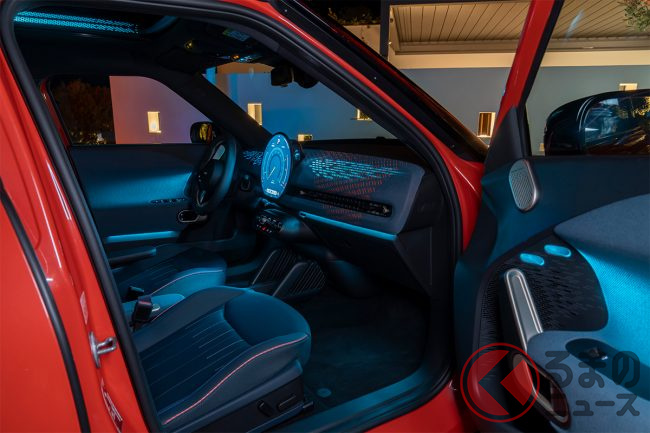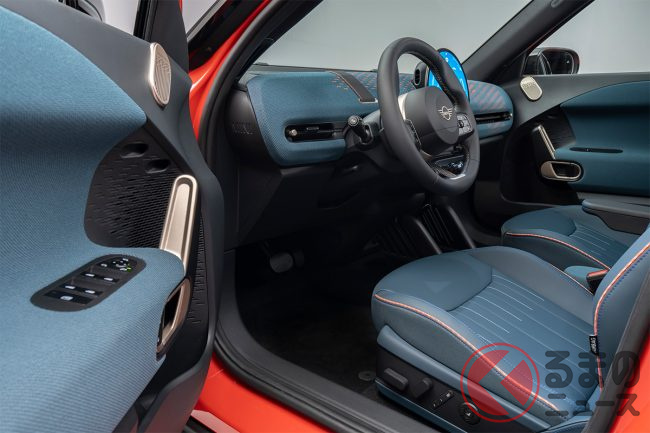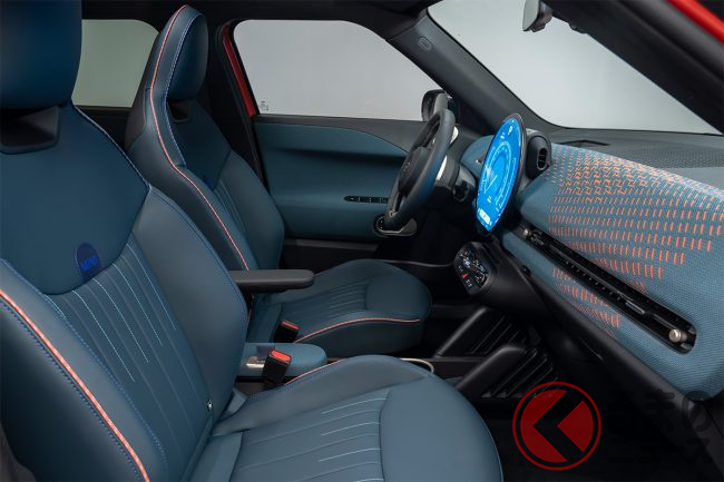 コックピットはクーパーのEV版と同様、大型の円形センターディスプレイを中心とするシンプルなデザインです。運転席の正面には何もなく、速度などの各種情報はヘッドアップディスプレイに表示。アンビエントライトでさまざまなムードを演出できます。