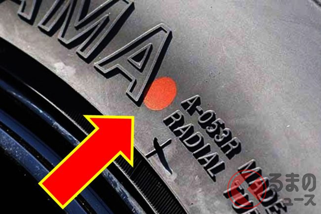 なお余談ですが、新品タイヤなどにはタイヤに赤色や黄色の丸いマークが付いていることがります。