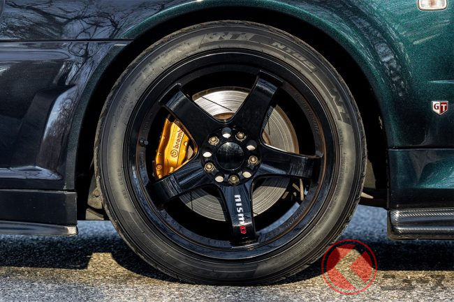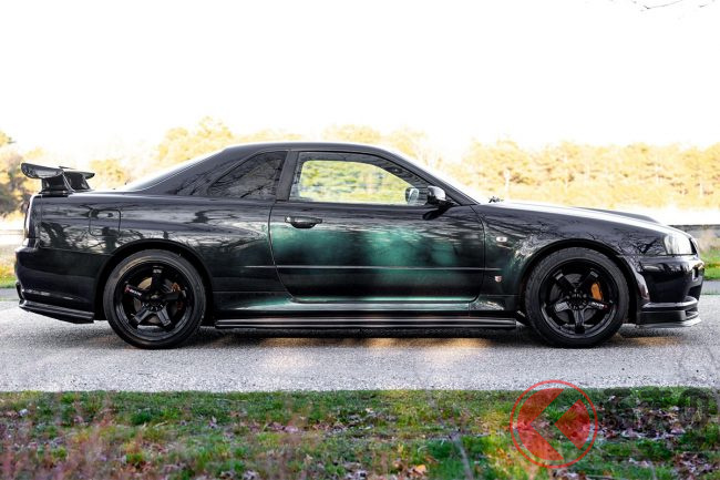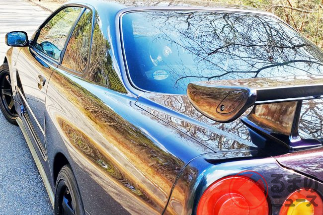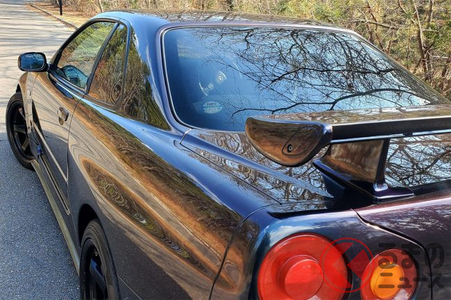 ボディカラーは、BNR34型のなかでも非常に人気の高い「ミッドナイトパープルII」(深紫色)でした。