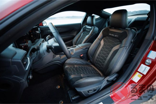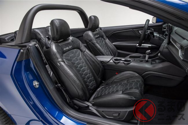 インテリアにはシェルビー仕様のアップグレードを実施。刺繍入りのフロアマットやシリアルナンバー入りのダッシュプレートなどを装備しています。
