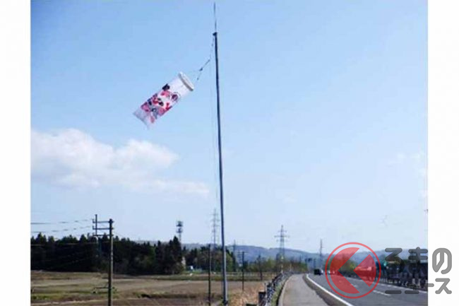 このように高速道路にはドライバーのためのさまざまな設備がありますが、高速道路を運転していると、緑色と白色の縞模様をした「鯉のぼり」のようなものが道路脇に設置されているのを見かけます。