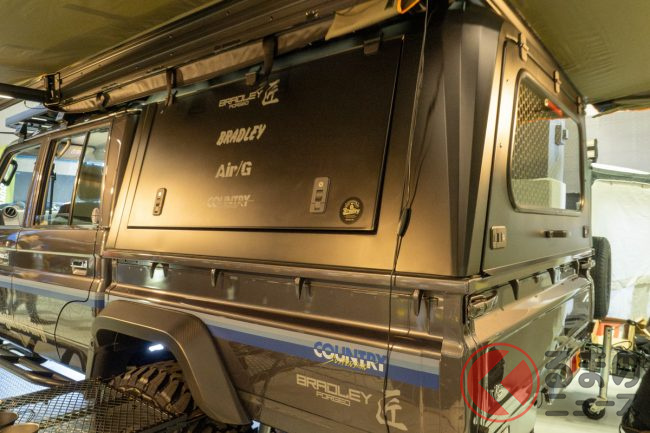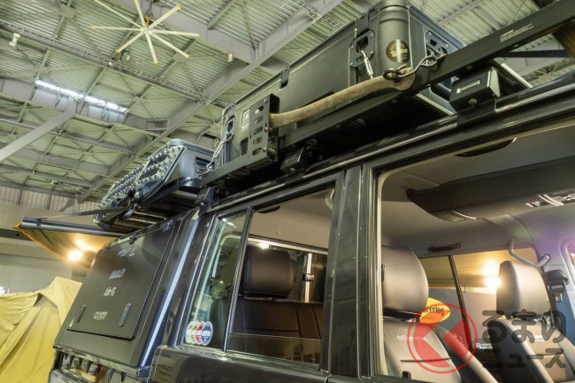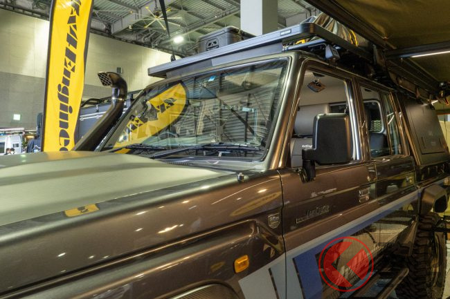 1台がオーバーランド風に仕上げた「ランドクルーザー70(GRJ79)」。「オーバーランド」というのは、北米などの原野が多く残る場所で野営しながら旅をすることを指す言葉で、そこから転じて、足回りを強化しSUVにルーフトップテントやサイドオーニングといった装備を追加したカスタムを示しています。