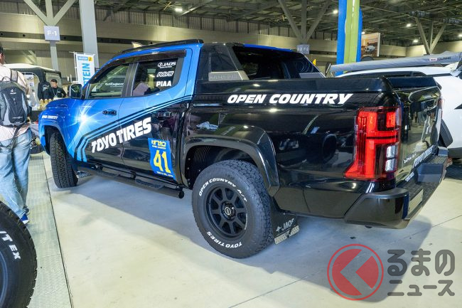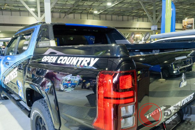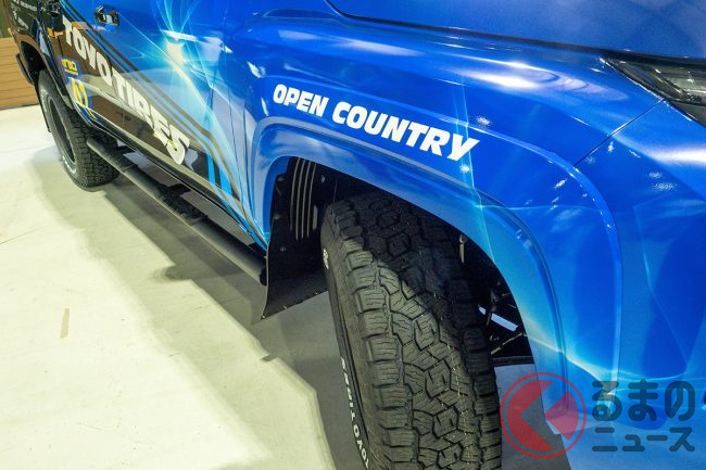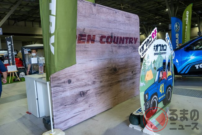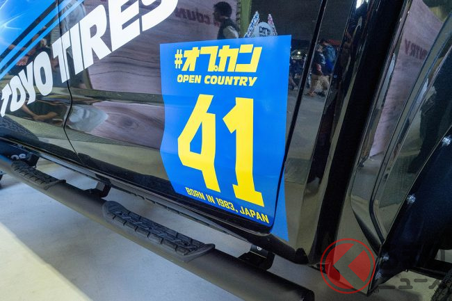 今回のトーヨータイヤのブースでは、2024年に誕生41周年を迎えたブランド「OPEN COUNTRY(オープンカントリー)」が展開されていました。メインとなるのは、そのオープンカントリーのタイヤを装備した3台の車両展示です。