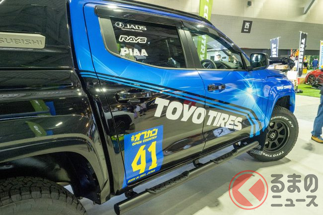 まず、ブース中央に置かれていたのが三菱「トライトン GSR」です。車体はトーヨータイヤのイメージカラーであるブルーを基調にしつつ、サイドからリアにかけてブラックで塗装されており、後部ドアには「#オプカン41」のデザインが施されていました。