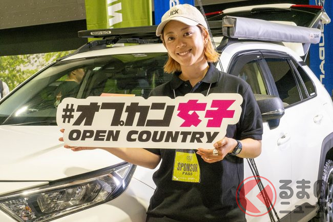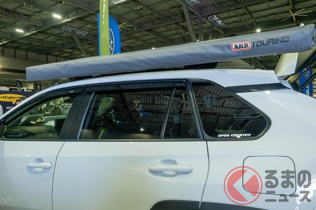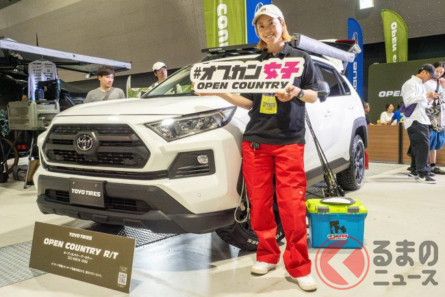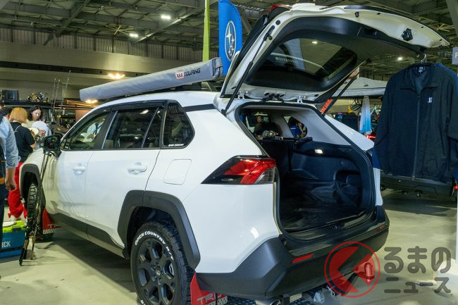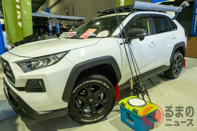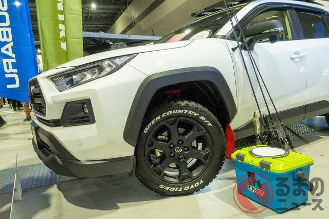 その隣に置いてあったのがトヨタ「RAV4」です。こちらはマルチアングラーとして活躍するオプカン女子・一木花漣さんの愛車であり、外装にはロッドホルダーなどフィッシング向けのカスタムが施されています。