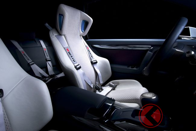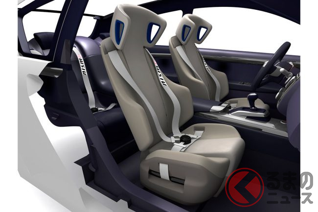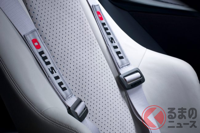 フロントシートはライトグレーのバケットシートが備わり、「NISMO」のロゴがあしらわれた4点式シートベルトを装着。その一方で、素材にはレザーとスエードを用いるなど、上質な印象も与えます。