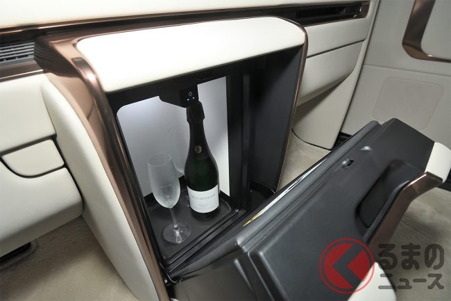 前後席間にパーティションを設けており、そこには48インチ大型ディスプレイと冷蔵庫が収まります。