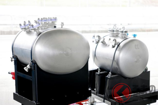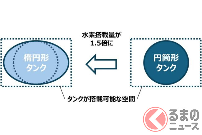 これは現在の法律において液体水素タンクをクルマに搭載する法律がないために従来の「高圧ガス保安法」の解釈で、高い圧力を均等に分散できるように円筒形となっていたことが要因です。