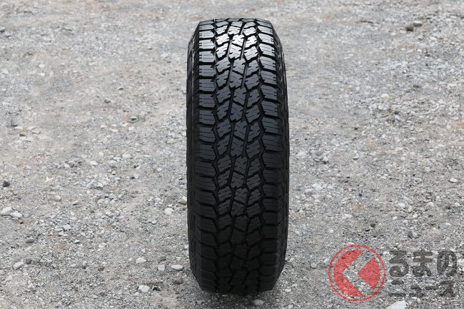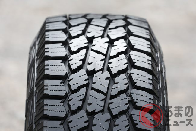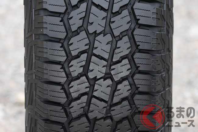 従来品に相当するジオランダー A/T G015は、舗装路用タイヤに近い「表面に溝を刻んだデザイン」ですが、ジオランダー A/T4では「ブロックを並べた形状」へと大きく変更しているのです。見るからに武骨で、オフロードタイヤらしいワイルドな雰囲気といっていいでしょう。