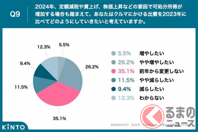 このような傾向は「クルマ」についても同様で、仮に可処分所得が増えたとしても、「クルマにかける出費を前年から変更しない」がトップとなっています。
