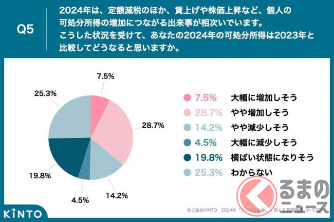 まず、所得から税金や社会保険料などを差し引き、自分の意思で自由に使える「可処分所得」が24年に「増加しそう」と回答したのは約4割と、「減少しそう」の2割弱を上回ったことが明らかになっています。