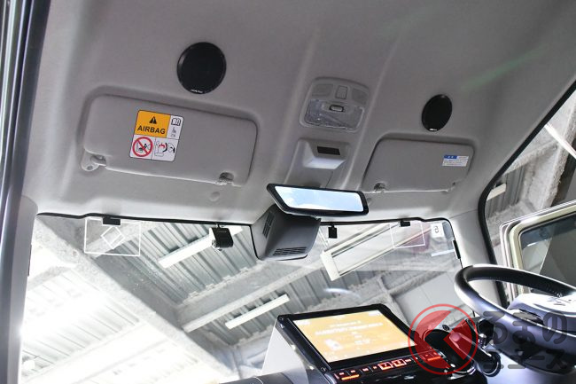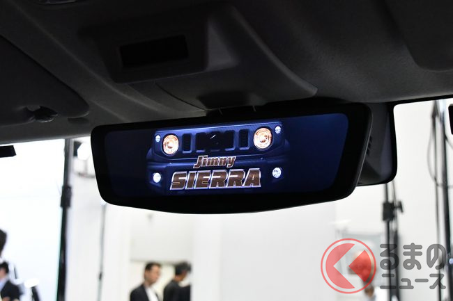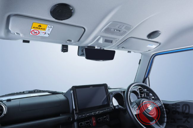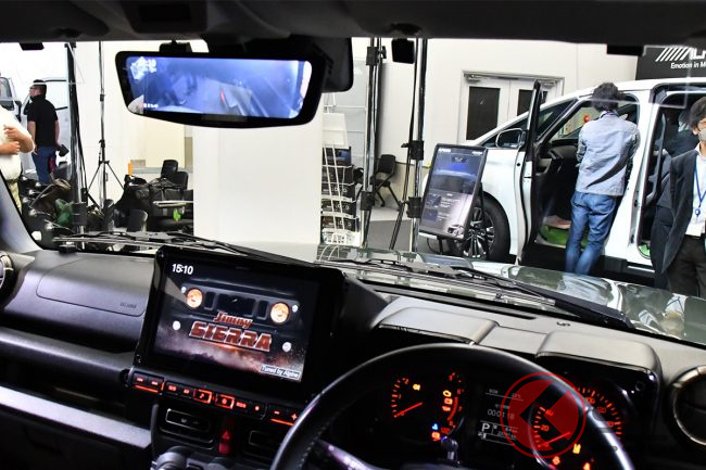 実際にデモカーに装着されている現物を見ると、ジムニー/ジムニーシエラ純正のルームミラーよりも上方に装着されることで、純正と比較してより前方視界がよくなっていることが確認できます。