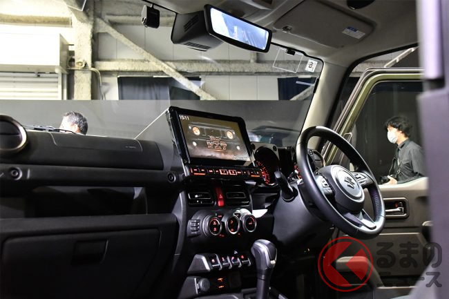 ジムニー/ジムニーシエラの車室空間で、ルームミラーとナビの間隔が狭い点に着目。大画面化する上で、既存モデルの9型ナビを10型に置き換えるだけではダッシュボード上にナビがせり出すため、前方視界に影響が出るという課題もあったと言います。