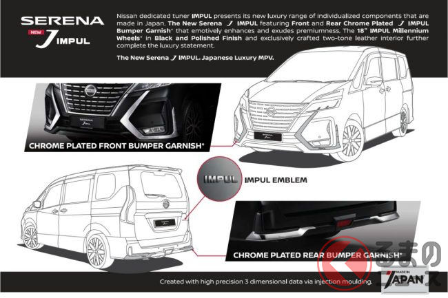 今回マレーシアで展示されたのは、セレナの上級グレードであるプレミアム ハイウェイスター パッケージをベースに、IMPUL(インパル)がカスタマイズを施したマレーシア独自仕様のセレナ J IMPULです。