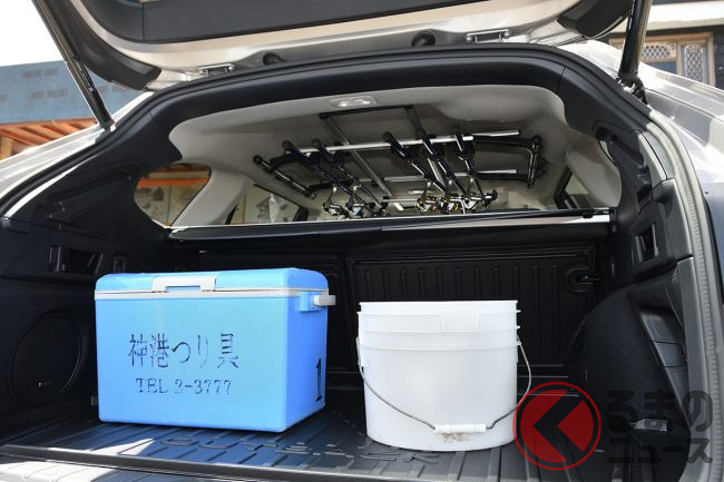 荷室にはディーラーで買えるカーゴトレーマットが敷いてあって、濡れた釣り道具を気兼ねなく載せられるし、天井に釣竿を掛けられるロッドホルダー(これは社外品)が付いていたり、まさに釣り仕様になっていました。