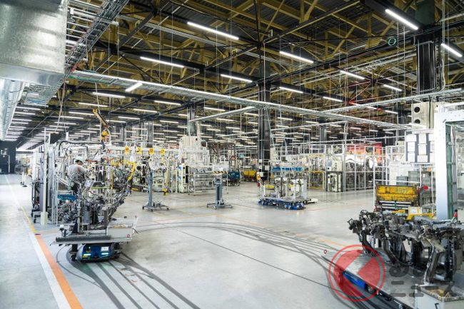 そんなGRファクトリー内には、従来のベルトコンベアーでクルマが運ばれるのではなく、代わりに「AGV(無人搬送機)」で運ばれています。