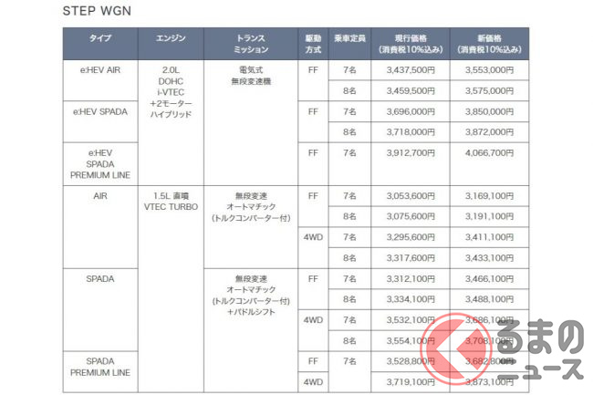 また、エアロパーツを装備した「SPADA」の現行価格は331万2100円(FF)から391万2700円(e:HEV PREMIUM LINE)までとなっており、改定後は346万6100円から406万6700円と15万4000円の値上げとなります。