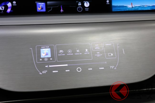 スイッチオンで画面が浮かび上がる特徴があり、インダッシュの画面の方が、車載インフォメーションシステムの未来感を演出するには、より面白いといえそうです。通常の液晶ディスプレーであるため、搭載にはある程度のスペースが必要となりますが、このようなインダッシュ仕様のものならば問題とならないため、有機ELよりもコストを抑えられることは自動車メーカーにとって大きな魅力でしょう。