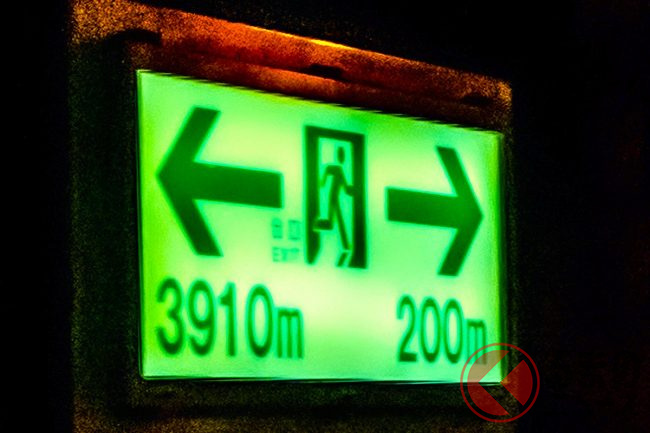 長いトンネルの中を走行していると、途中で「非常口」と書かれた緑色の看板とドアが設けられているのを目にします。