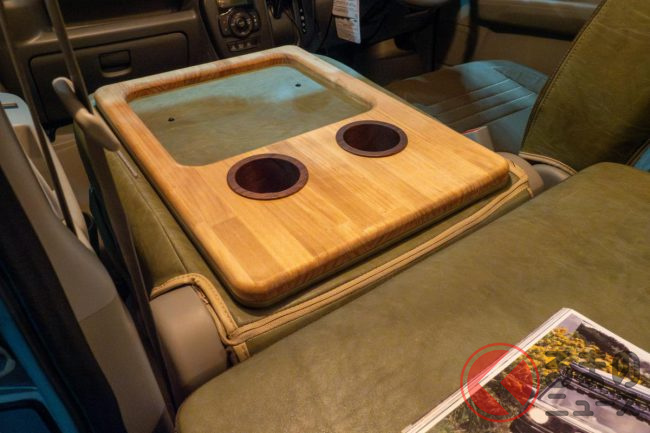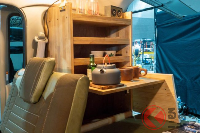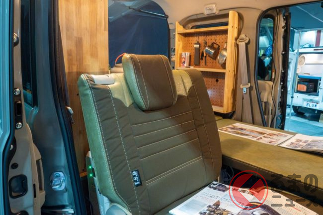 内装は木目ラックなど備えたナチュラルな装いになっています。座席シートはカーキグリーンを基調にしたカバーを装着。後部座席を倒して、フルフラットにすることも可能です。