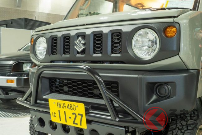 フロントフェイスには、ジムニーのデザインのグリルや丸目系のヘッドライト、フロントバンパーが装備され、すっかり“ジムニー顔”に。さらに、ドッシリとしたバンパーガードも備えています。